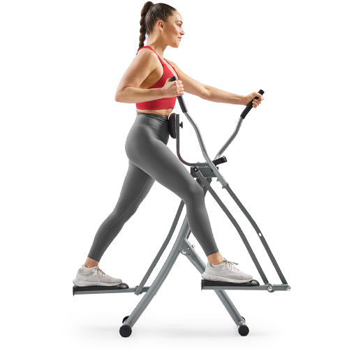 The Smart Air Walk Trainer is a versatile exercise machine offering a low-impact, full-body workout suitable for adults and seniors of all ages and fitness levels. Its unique air walking motion combines the ease of walking, the glide of skiing, and the endurance of cross-country skiing with the calorie burn of running, minus the impact, caters to a variety of workout intensities. This machine is also equipped with Bluetooth connectivity, providing access to a vast range of training videos and virtual world tours, including simulated cross-country skiing experiences. Its compact and foldable design makes it ideal for space-saving storage. An LCD digital monitor allows for tracking workout metrics, and a device holder adds convenience for entertainment or fitness apps. Non-slip pedals ensure safety and stability during use. The Smart Air Walk Trainer is easy to assemble and backed by Sunny Health & Fitness's commitment to quality, including a 1-year structural frame warranty.